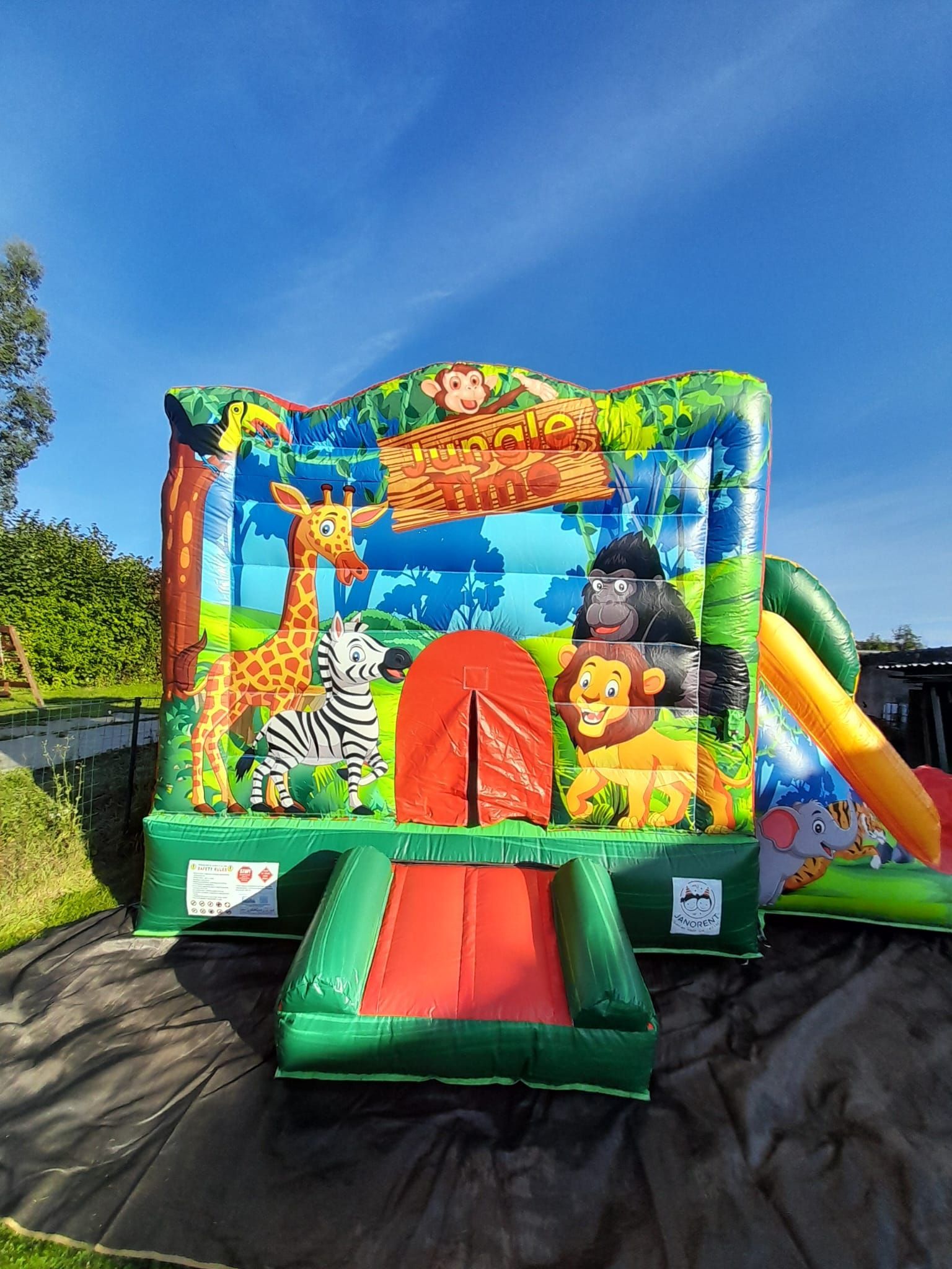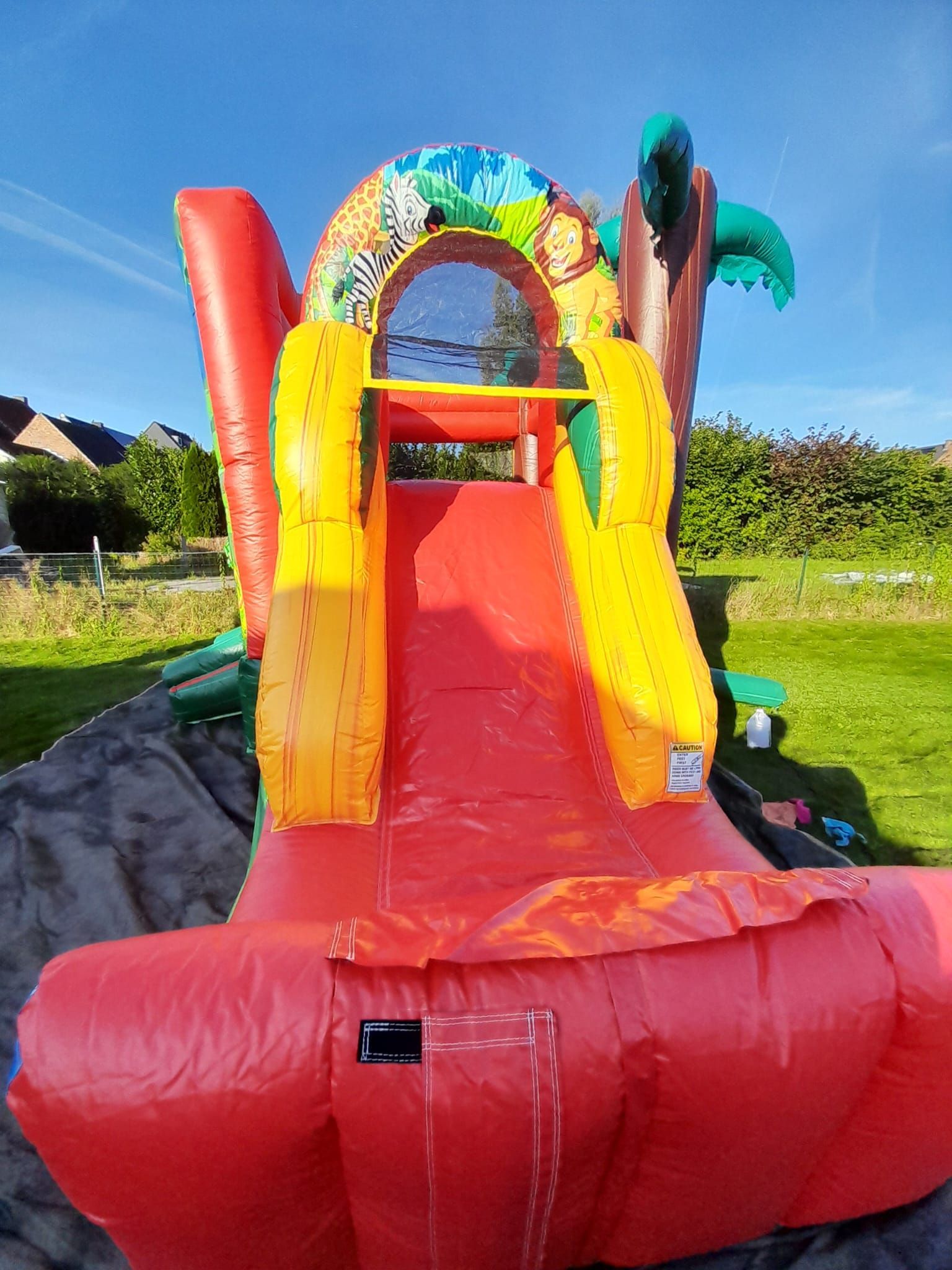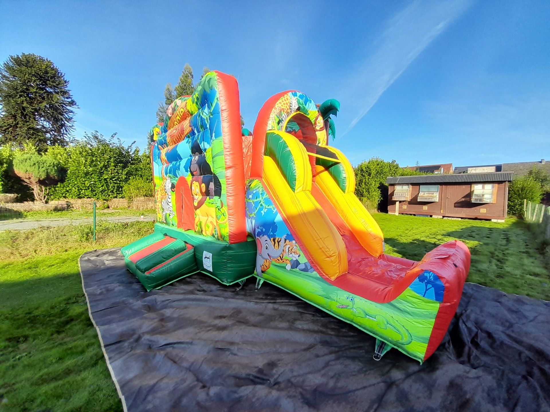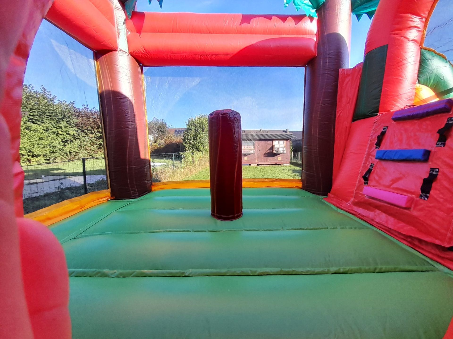 Binnenin is er ruimte om te springen. Via de glijbaan verlaat je het springkasteel. Doordat het springkasteel in de lengte is gericht, staat deze ook ideaal in een smallere tuin.
